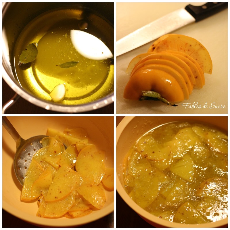 3. Mientras tanto, en una cacerola, mezcla el vinagre de manzana, el aceite de oliva virgen extra, el azúcar, la sal, el ajo y la hoja de laurel. Poner al fuego y llevar a ebullición, añadir un tercio de los caquis, dejar que esta «salmuera» vuelva a hervir durante tres minutos, moviendo ocasionalmente con una cuchara de madera. Saca los caquis con una espumadera, escurre y deja enfriar en un bol y repite el proceso con el resto de los caquis.